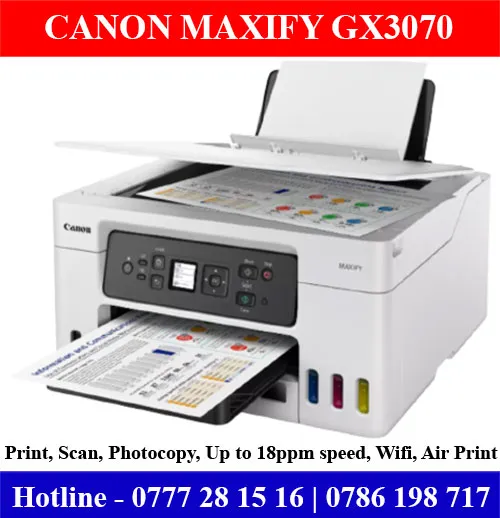 Canon GX3070 Printer Sri Lanka sale with discount price and 1 year warranty. Canon MAXIFY GX3070 Mega Tank printer is good printing speed pigment ink printer come with ink tank system. Very good for hard use office, shops and business in Sri Lanka.