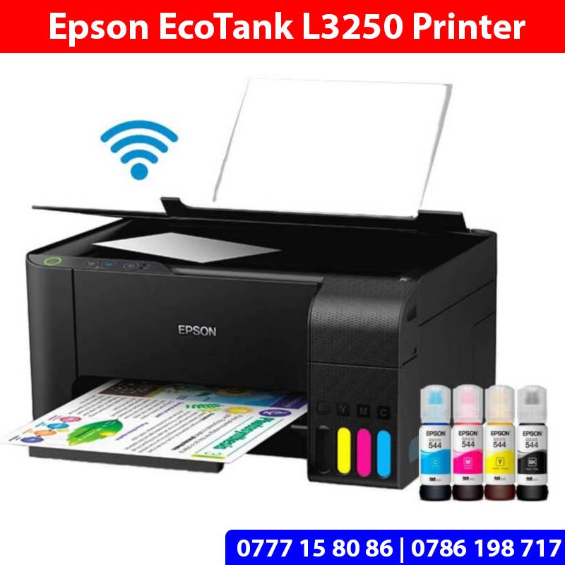 Epson EcoTank L3250 Printer Sri Lanka sale with Discount Price and 01 year warranty. Epson EcoTank L3210 wifi Multi Function Colour Printer come with print, Scan, Photocopy and Wifi features. Very economical colour printer for Home use, Office use and Shop use in Sri Lanka.